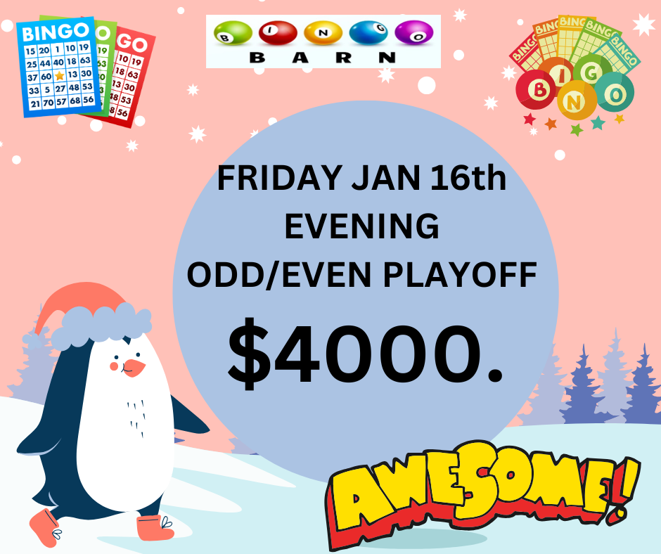 BONANZA PLAYOFF Mystery Dauber on January 15, 2026 BONANZA PLAYOFF…. SATURDAY JAN 17thAFTERNOON EVENT$15,000* *If not won prior The Bingo Barn – The Place to Pkay and WIN BIG Everyday!