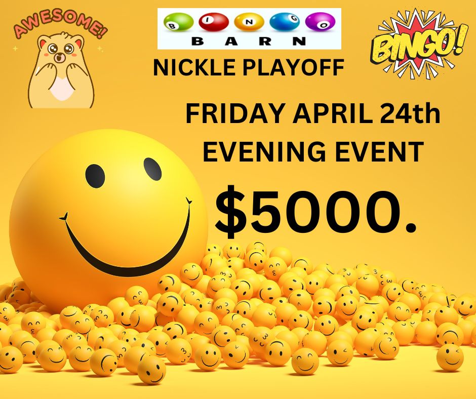 NICKLE PLAYOFF Mystery Dauber on April 24, 2026 NICKLE PLAYOFF FRIDAY APRIL 24th EVENING EVENT $5000. Join us for an evening of bingo fun and your chance at some BIG BUCK$ The Bingo Barn – The Place to Play and WIN BIG EVERYDAY!